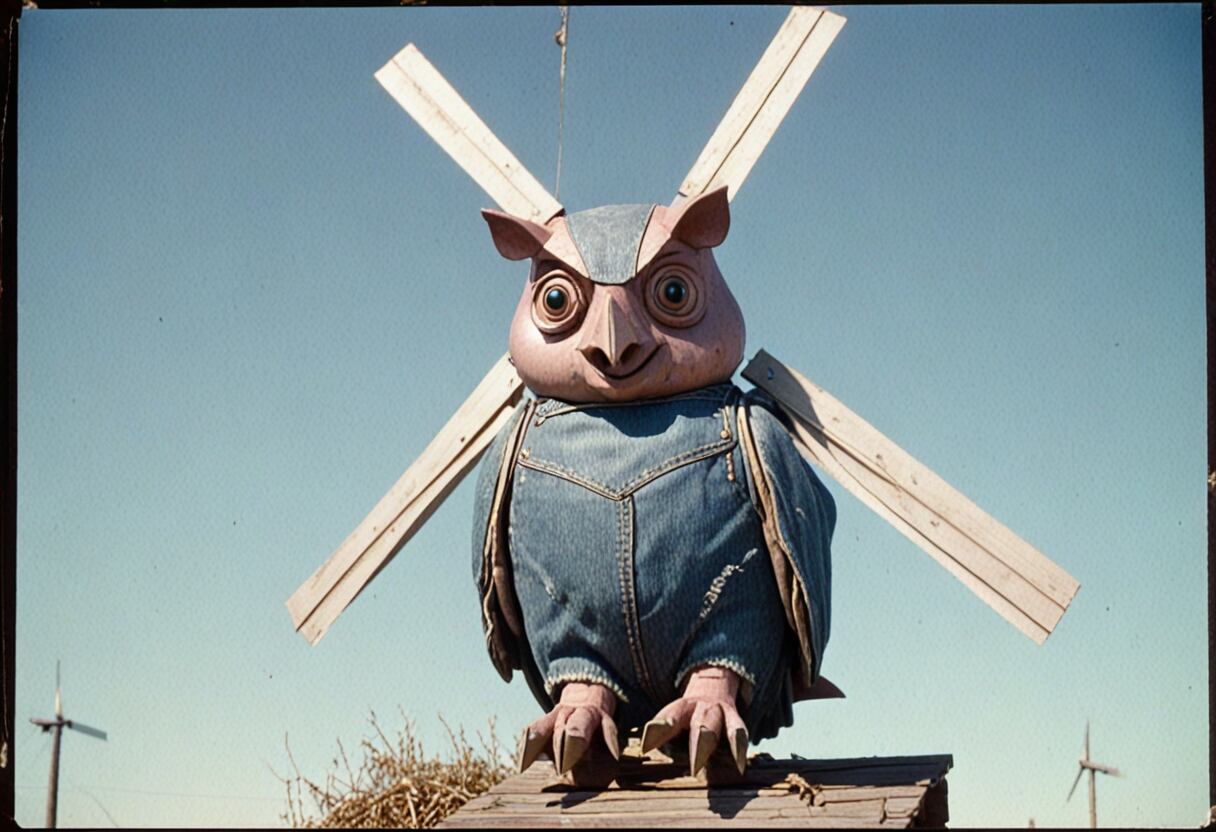 画像に描かれているのは、デニム生地で作られた体と木材のような素材で作られた頭を持つフクロウの彫刻です。フクロウは大きな丸い目をしており、背景には風車があり、その帆が空に向かって伸びています。この画像は、デニムの質感と木の素朴な外観を組み合わせたアート作品を示しており、伝統的な風車の建築と対比されています。