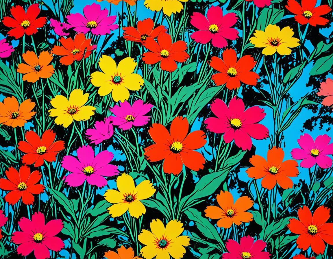 この画像は、ポップアートスタイルの花のパターンを描いたものですね。赤、ピンク、オレンジ、黄色の花が黒い輪郭で強調され、青と緑の葉の背景に映えています。色のコントラストとスタイライズされた花がとても印象的で、視覚的に魅力的です。
