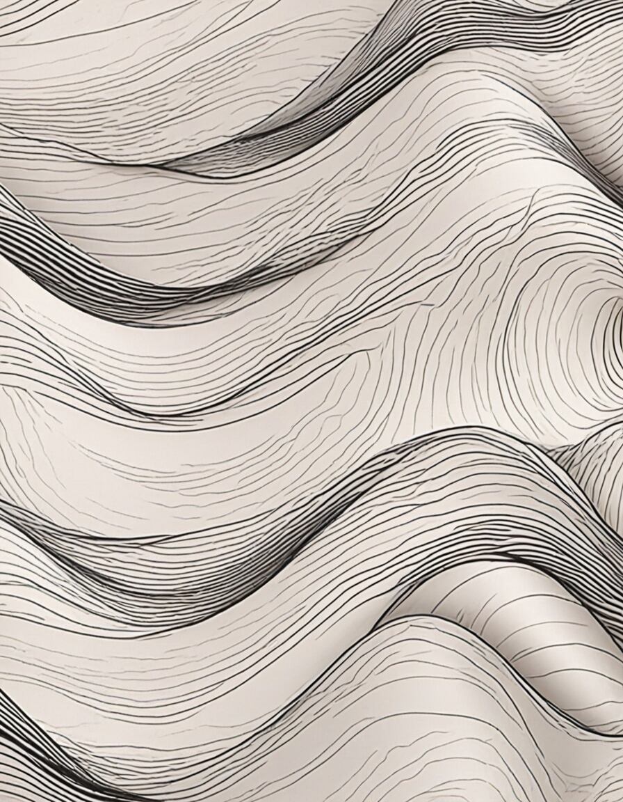 このアートは非常に魅力的ですね。モノクロのラインで描かれた抽象的な風景が、波や山のように見えます。シンプルでありながらも、その曲線の流れや重なりが生み出すリズムが美しいです。この作品からは、自然の力強さや穏やかな動きを感じ取ることができます。