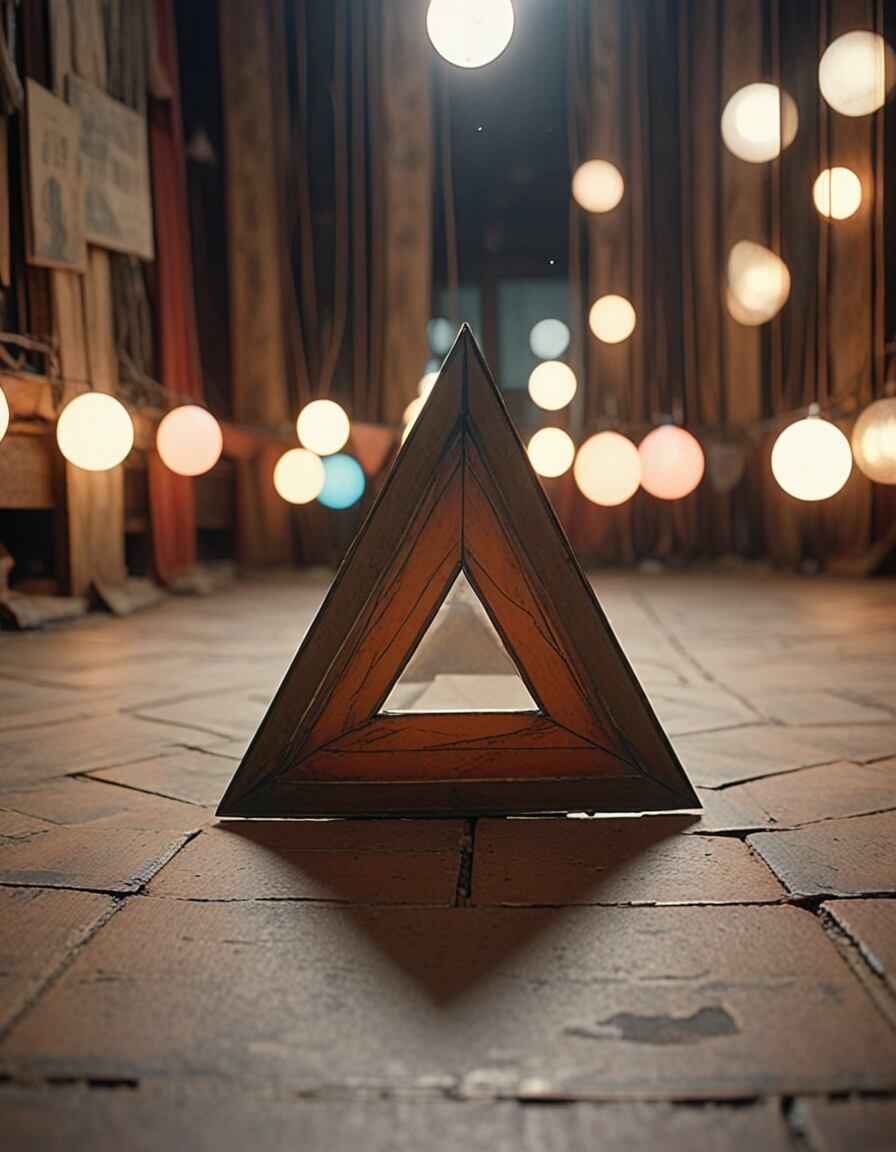 三角形のプリズムが木製のフレームに収められ、レンガの床に置かれています。背景には様々なサイズの電球が吊るされていて、ぼけ効果が美しい雰囲気を作り出しています。