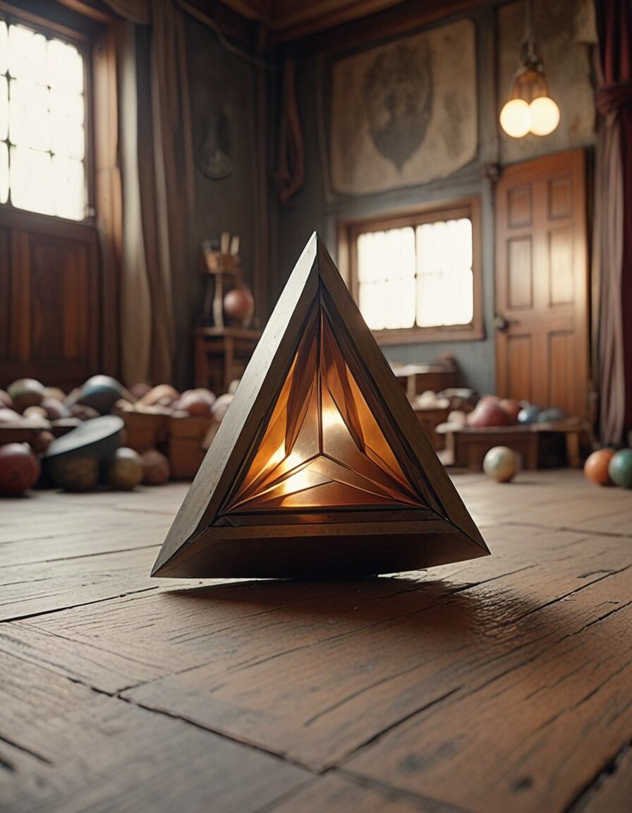 三角形のプリズムが木製のフレームに収められ、レンガの床に置かれています。背景には様々なサイズの電球が吊るされていて、ぼけ効果が美しい雰囲気を作り出しています。