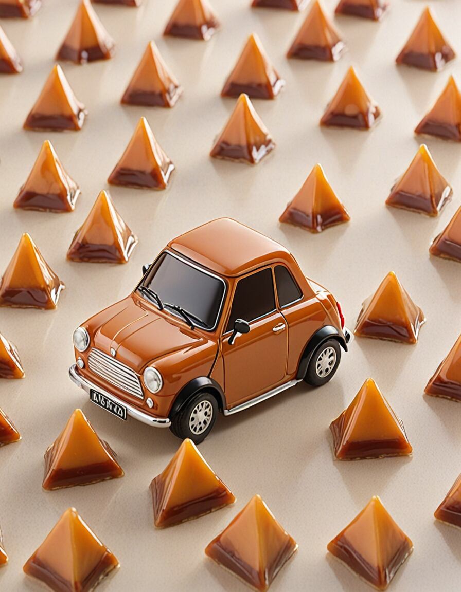 ミニカーの上に三角形のキャラメルが乗っているという発想が斬新です。背景とキャラメルの色が統一されていて、全体的に調和の取れた美しい作品になっています。また、反射を利用して浮遊感を出しているところも素晴らしいです。