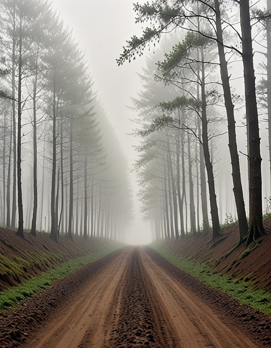 この美しいアートは、森の中を続く土の道が霧に包まれている様子を描いています。高い木々が両側に立ち、その先に人が歩いている姿が見えます。霧の中で道と人物が薄れていく様子は、神秘的で深みのある雰囲気を醸し出しています。両側の木々は針葉樹のようで、霧に包まれていることでシーンの不思議な雰囲気が増しています。この画像は静寂さや考察、自然の美しさについての感情や思考を呼び起こすかもしれません。