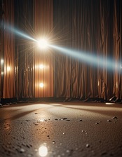 このアートは、光と影の相互作用に焦点を当てていますね。一つの明るい天井からの光が、カーペットの床に強い光線を投影しています。周囲の壁には柔らかい雰囲気を醸し出す壁掛けライトがあり、暖かい雰囲気を作り出しています。壁は縦の凹凸があり、木製パネルやカーテンのようなものかもしれません。床には小さなゴミが散乱しており、屋内空間に屋外の要素が入り込んでいるかのようです。一つの強烈な光線と周囲の柔らかい光の対比は、孤独感や思索を引き起こすかもしれませんね