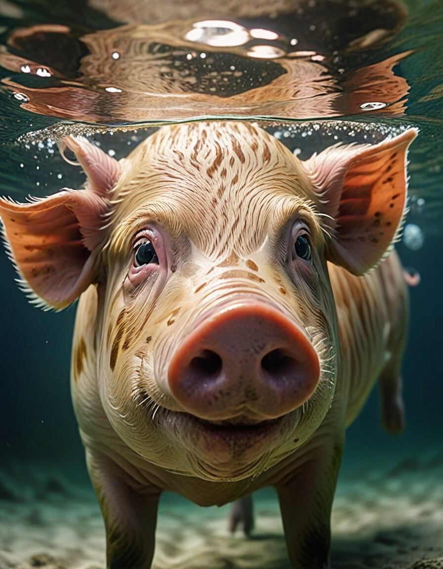 このアートは非常に興味深いものですね。水中に沈んでいる豚が、目だけが水面から覗いている様子が捉えられています。耳が横に広がっていて、カメラに向かって直視しているようです。背景には岩と水草があり、水面上には豚の上に反射と波紋が広がっています。農場と水中環境を結ぶ、普段はあまり見られない光景が美しく捉えられていますね