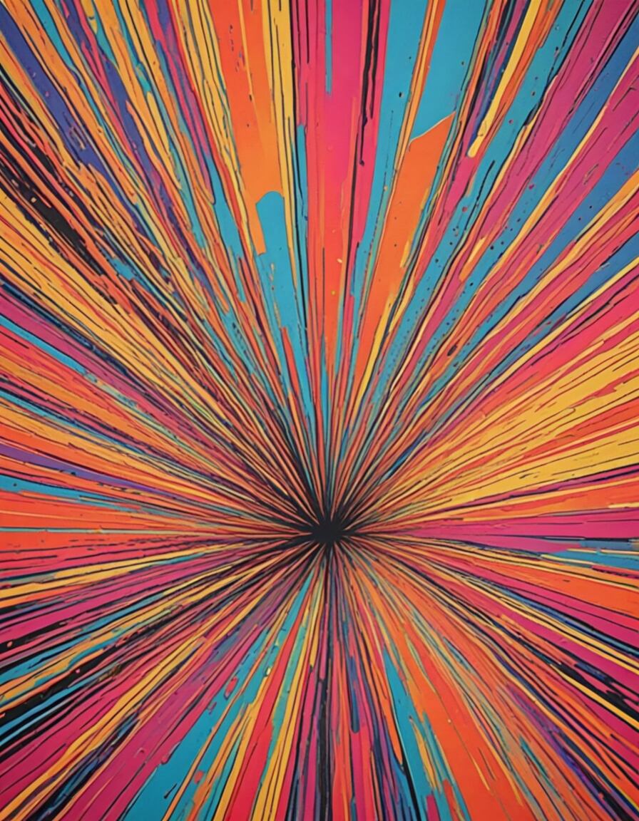 このアート作品は、非常にダイナミックでエネルギッシュな印象を与えます。カラフルな線が中心から外側に向かって放射状に広がっており、爆発的な動きを感じさせます。このデザインは、まるで光やエネルギーが一点から広がっていく様子を表現しているようで、見る者に強いインパクトを与えます。