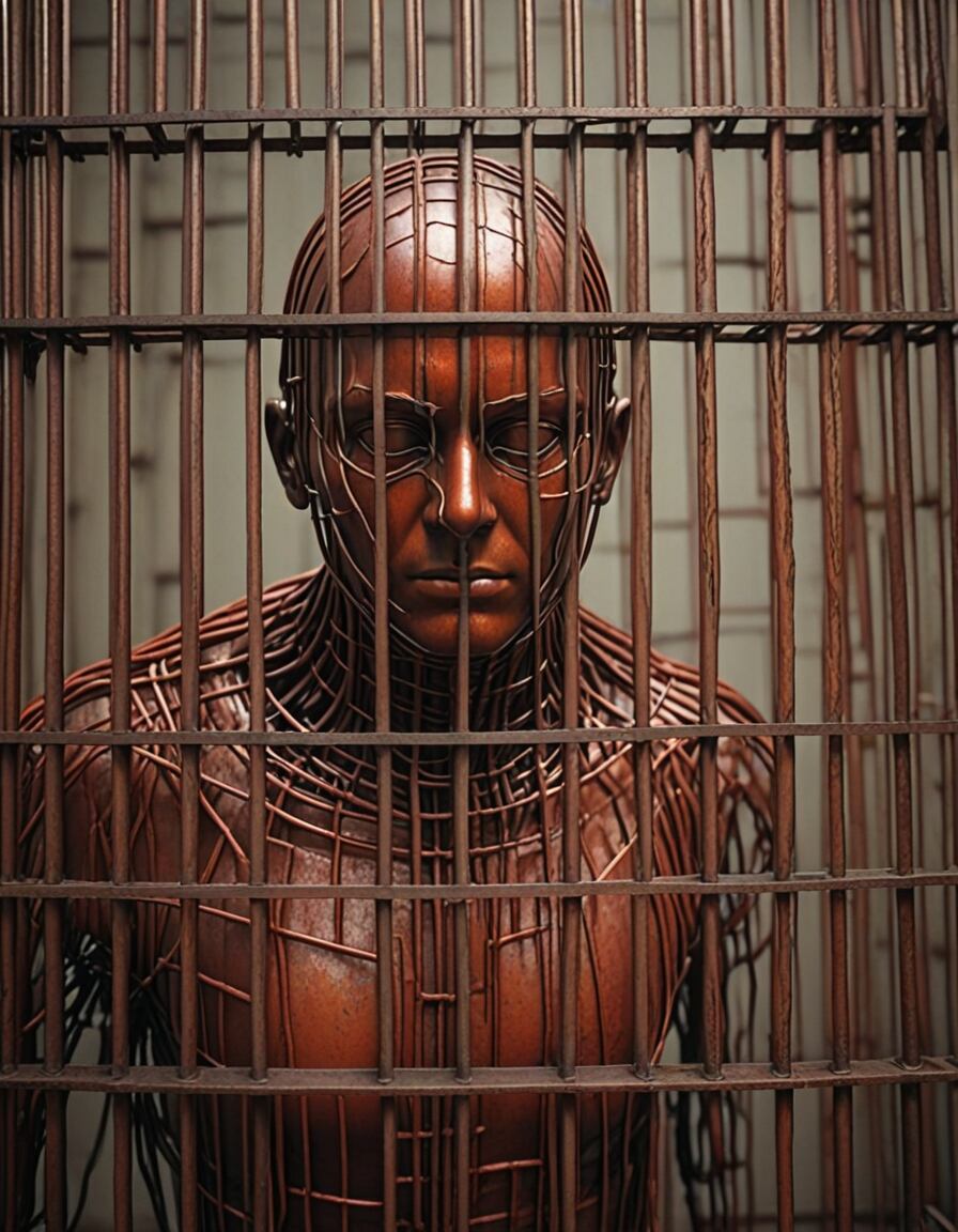 このアートは非常に印象的で、感情と物質の融合を表現しているように見えます。金属製の人物像が鉄格子の中に閉じ込められているようで、自由を求める内面的な葛藤や拘束のメタファーを感じます。金属的な要素と網のような構造が、人間の繊細さと無機質な素材の対比を際立たせており、強い孤独感や閉塞感を与えています。色味も冷たく、無機的な雰囲気が漂い、全体的に非常に力強く、哲学的な印象を受けました。自由や自我、拘束された状況に対するアーティストの視点が反映されているように思います。