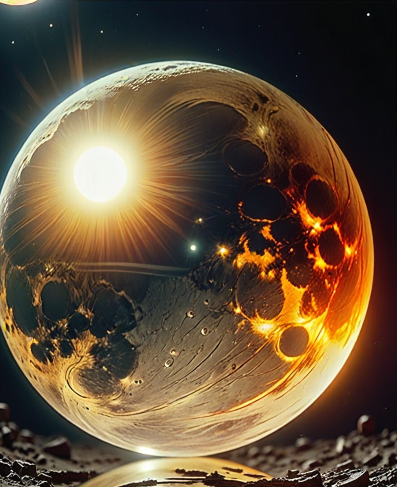 このアートは、非常に幻想的で未来的な風景を描いているね。いくつもの巨大な球体が空中に浮かんでいて、それぞれが月の表面のような模様を持っている。光と影のコントラストが美しい。
