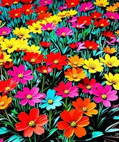 このアートは非常にカラフルで鮮やかな花々が描かれていて、美しい自然の豊かさを強調しています。赤、ピンク、オレンジ、黄色の花が密集して咲いており、背景には緑の葉が描かれています。色のコントラストが鮮やかで、視覚的に非常に魅力的です。全体的な印象としては明るくポジティブで、見ている人に元気や喜びを与えるような作品です。自然の美しさを感じさせるこの作品、